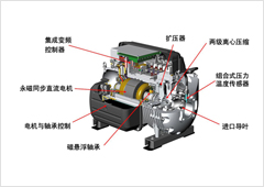 磁懸浮壓縮機主要組成部分由鋁合金精密鑄造的壓縮機機體、兩級壓縮的離心葉輪、永磁體材料制成的一體化電動機轉子和驅動軸、永磁同步電動機、電磁軸承、可調節的進口導流葉片、AC/DC電源轉換系統、電磁軸承控制系統和軟啟動控制系統等。磁懸浮變頻離心機通過高溫高壓氟里昂從空調壓機排出,進入冷凝器,向銅管冷卻水釋放熱量,冷凝為中溫高壓氟里昂液體,然后經過節流閥降壓為低溫低壓液體進入蒸發器,在蒸發器殼體內從流經銅管的冷凍水中吸收熱量,氣化為低溫低壓氣體后吸入壓縮機,在壓縮機內經過二次壓縮為高溫高壓氣體排出,通過這種循環,最終達到降溫的目的。